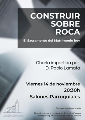 Este próximo viernes día 14 a las 20:30 h, en los salones parroquiales tendrá lugar esta charla «Construir sobre Roca«; con el subtítulo de Sacramento del Matrimonio hoy. Será impartida por D. Pablo Lamata.