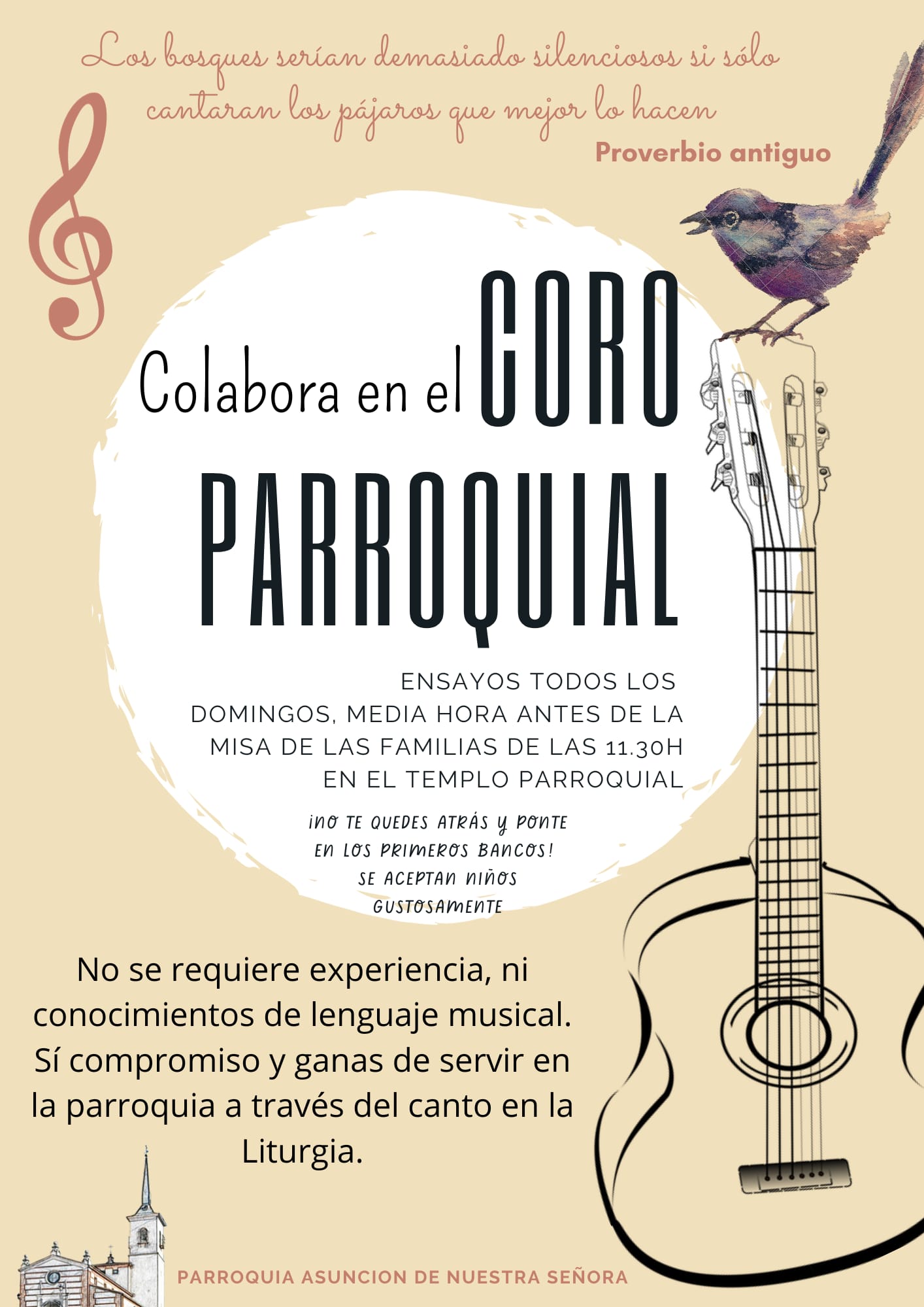 Colabora en el Coro Parroquial : Todos los domingos media hora antes de la misa de familias, 11:30 en el templo parroquial.