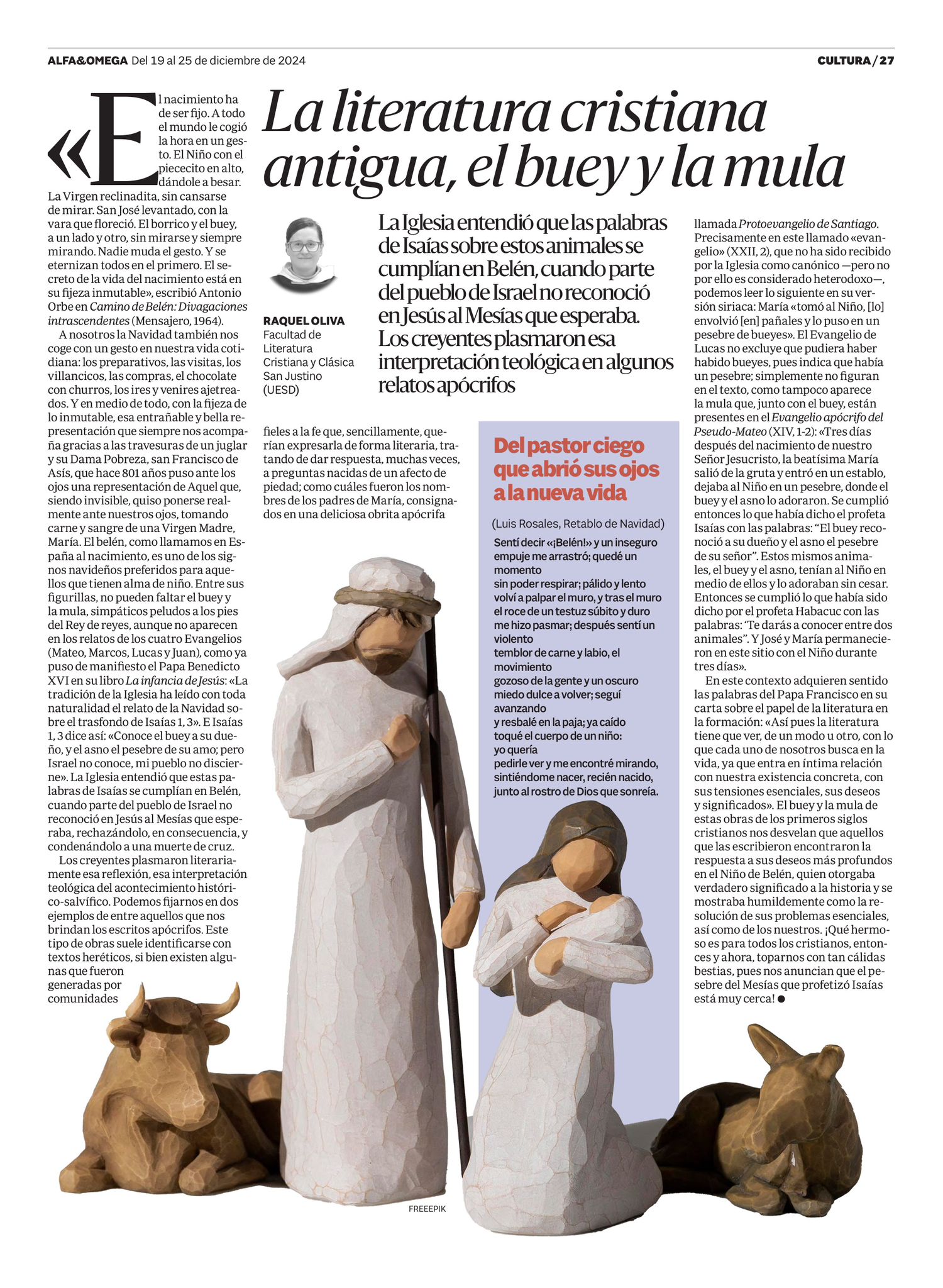 En el siguiente link 1380_19-12-2024.pdf de la Revista Alfa&Omega, en su último número aparece este interesante artículo de Raquel Oliva, donde nos informa de la presencia del buey y la mula; tan presente en nuestros belenes populares; y como están referenciadas en textos bíblicos y en evangelios apócrifos.