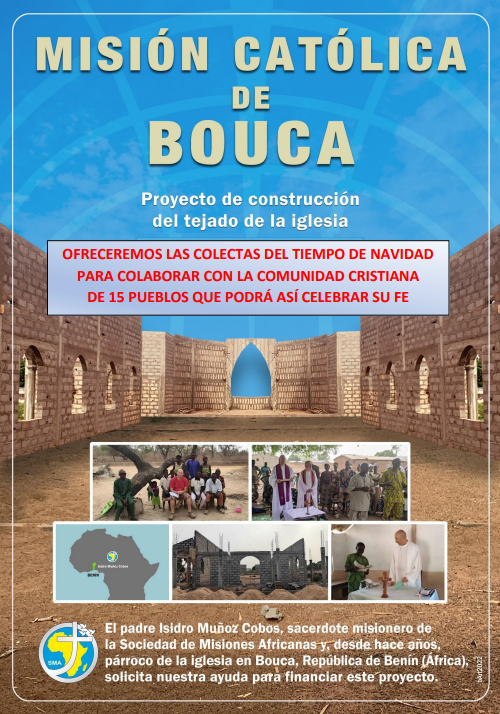 El P. Isidro Muñoz, de la Sociedad Africana de Misiones ( SMA ), tiene en Bouca, Benín; el proyecto de la construcción de una iglesia, que dará servicio a 15 comunidades. En concreto nos pide ayuda para la construcción del tejado. Por ello las colectas de todo el tiempo de Navidad que tengamos en la parroquia se destinarán a esta misión.