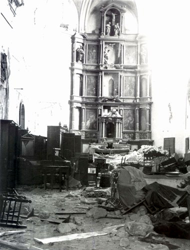 Al concluir la contienda, el templo había resistido aunque con importantes desperfectos, entre los cuales destacaba, dos inmensos boquetes en la cabeza y en la nave, provocados por la entrada de obuses. El valioso órgano había sido arrancado y quemado, así como todas las imágenes, que en Agosto del 36, fueron lanzadas abajo desde la Barbacana.