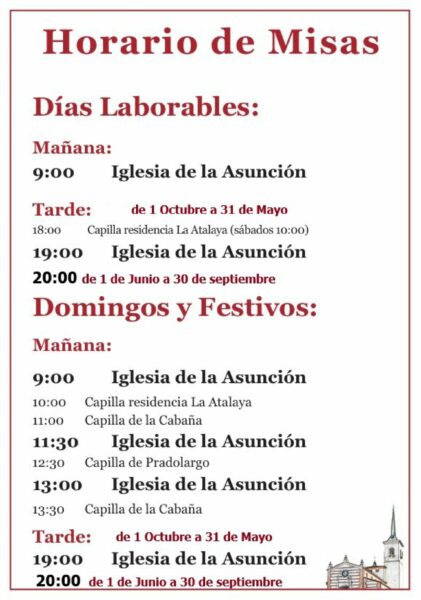 El horario de celebración de la misa de tarde, durante el año, es a las 19:00, excepto de 1 de junio a 30 de septiembre, que es a las 20:00